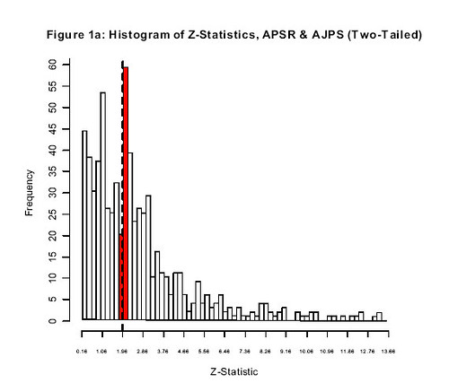 Do you learn much at p=0.04 but not much at p=0.07? Is that difference significant (statistically or otherwise)? In fact, the APSR and AJPS do appear to publish plenty of statistically insignificant findings, but there is a noticeable absence of papers falling just short of 1.96. Gelman, Drum, and the authors offer potential explanations of this distortion.