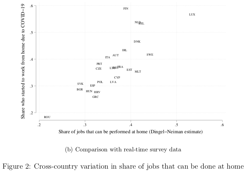In the United States, Alexander Bick, Adam Blandin, and Karel Mertens have been conducting a Real-Time Population Survey, an online survey of adults designed to mimic the Current Population Survey. Last week, they released a paper called “Work from Home After the COVID-19 Outbreak“. They report that 35 percent of their US respondents worked entirely from home in May 2020. Their Figure 1 shows that the share of respondents in an industry working from home in May is highly correlated with our estimate of the feasible share for that industry.