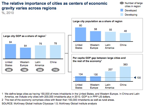 In a world of rising urbanization, the degree of economic vigor that the economy of the United States derives from its cities is unmatched by any other region of the globe. Large US cities, defined here as those with 150,000 or more inhabitants, generated almost 85 percent of the country’s GDP in 2010, compared with 78 percent for large cities in China and just under 65 percent for those in Western Europe during the same period. In the next 15 years, the 259 large US cities are expected to generate more than 10 percent of global GDP growth—a share bigger than that of all such cities in other developed countries combined.