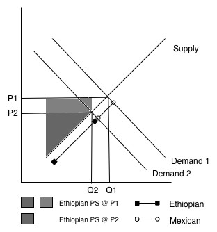 How does a downward shift in demand affect the supply curve? There is a change in quantity supplied, but not a change in the supply curve itself. As such, the marginal producers (Mexican coffee growers) will exit until equilibrium is reestablished. Does this help the Ethiopians?